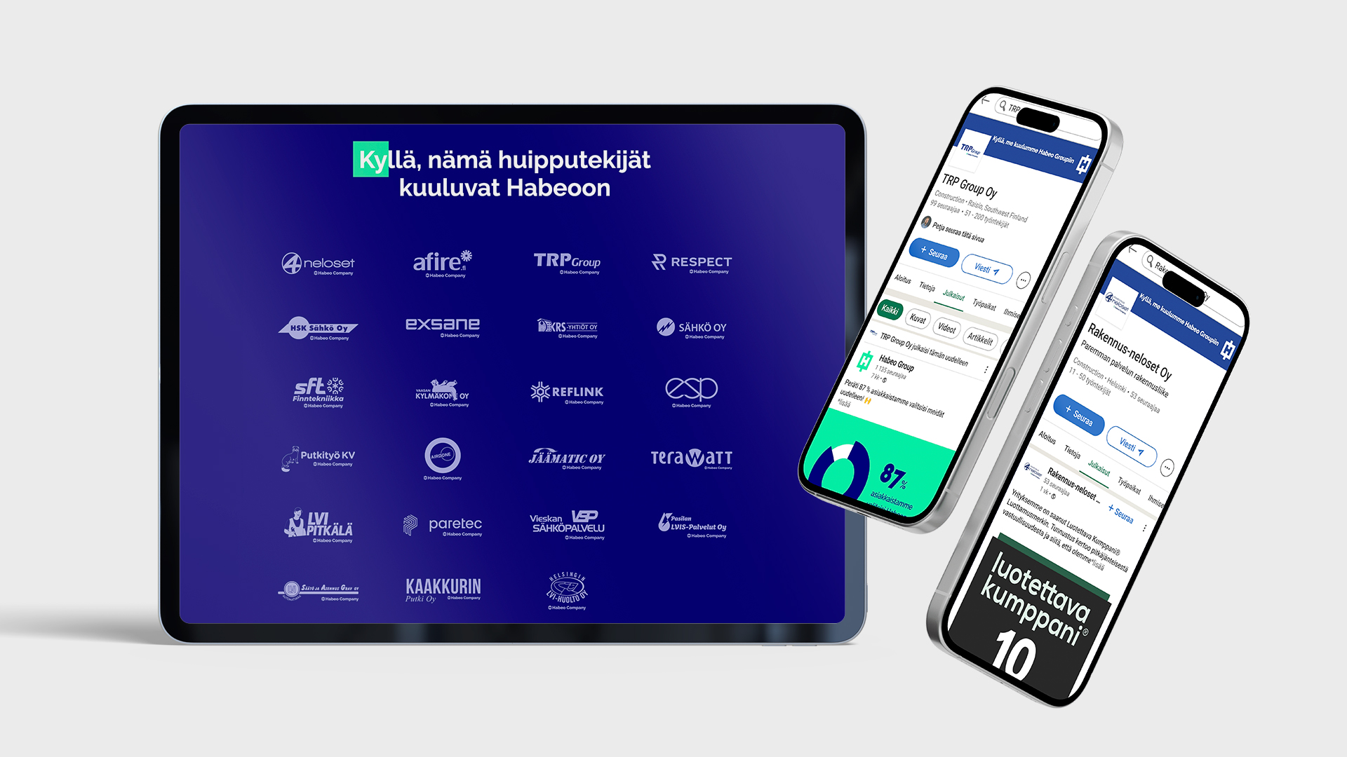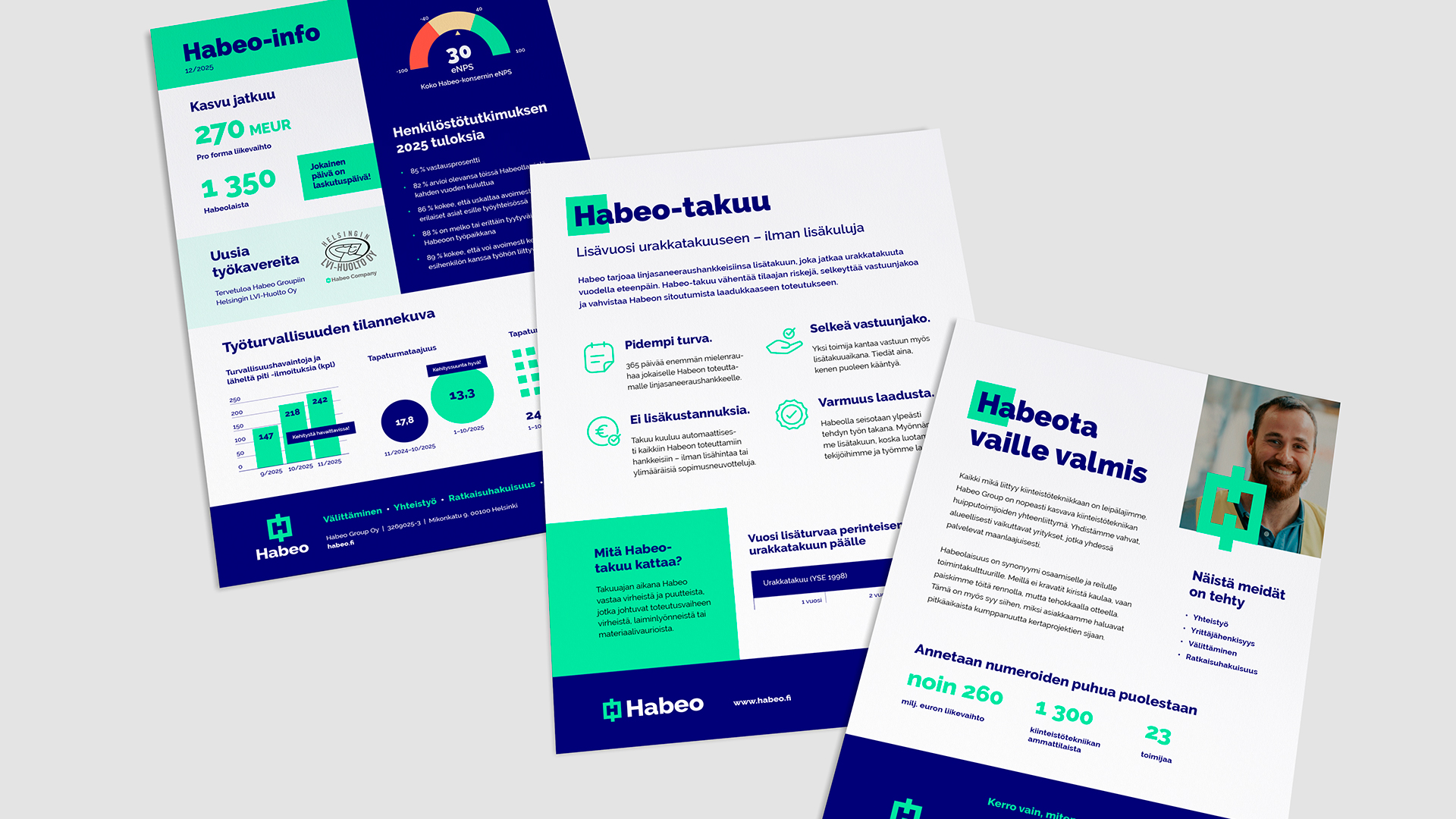 Olemme tukeneet Habeota erilaisten visuaalisten materiaalien suunnittelussa ja toteutuksessa tilanteen mukaan. Esimerkiksi uusille konserniyhtiöille on päivitetty logoaineistot ja muuta brändimateriaalia, jotta konsernin ilme pysyy yhtenäisenä kokonaisuuden laajentuessa.